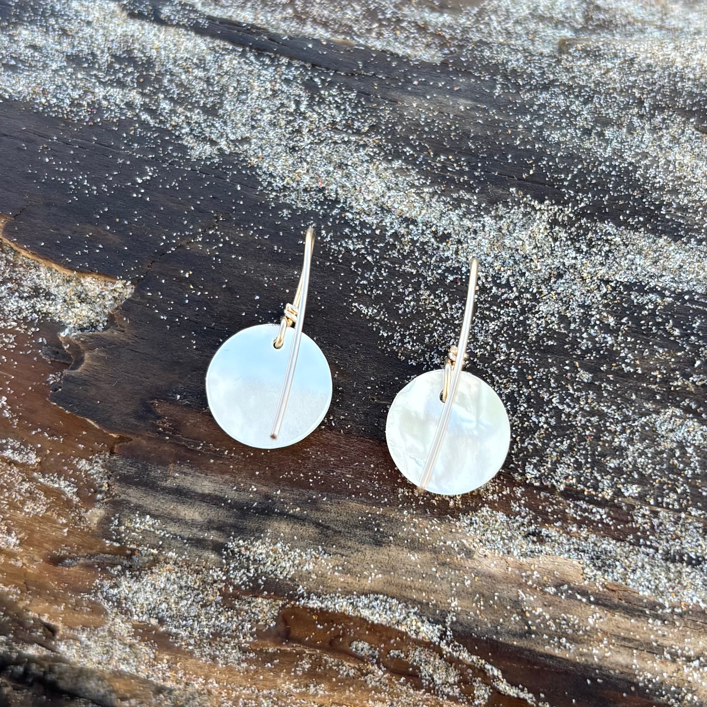 小さな丸いマザーオブパール(白蝶貝) の貝パーツと14KGFワイヤーを合わせたデザインです