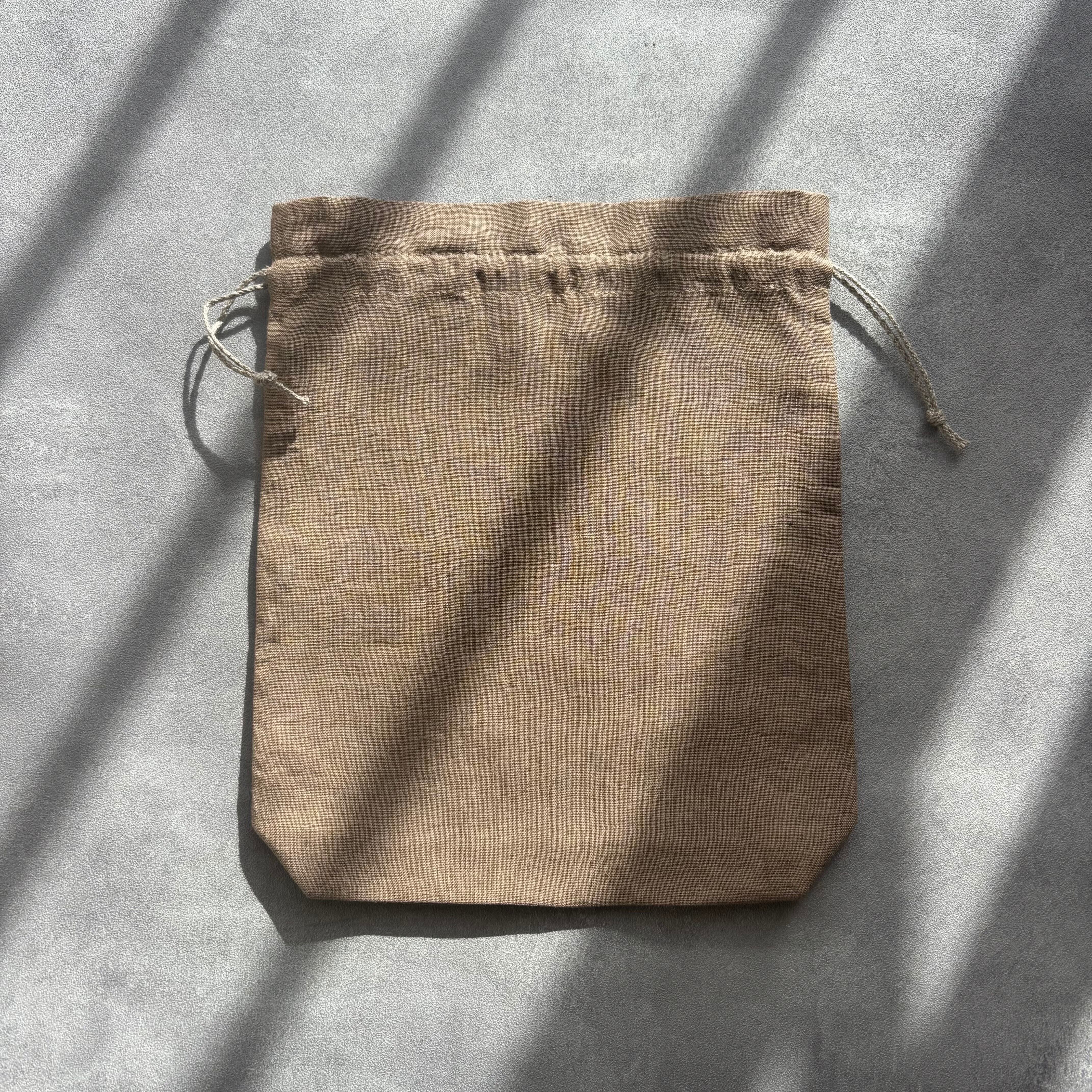 草木染め 巾着ポーチ Medium size リネン100% & リネン100%紐 color : くるみの果穂染め