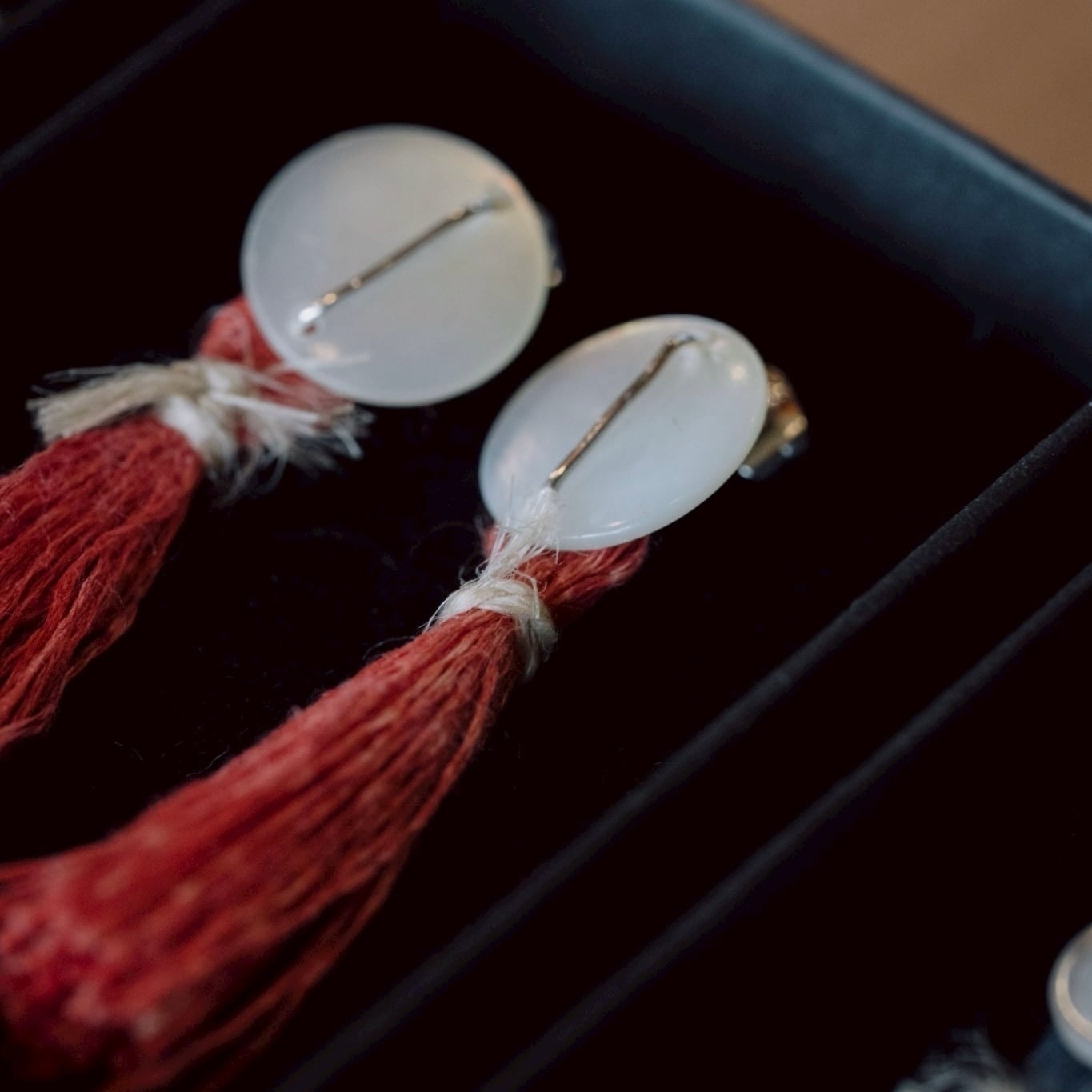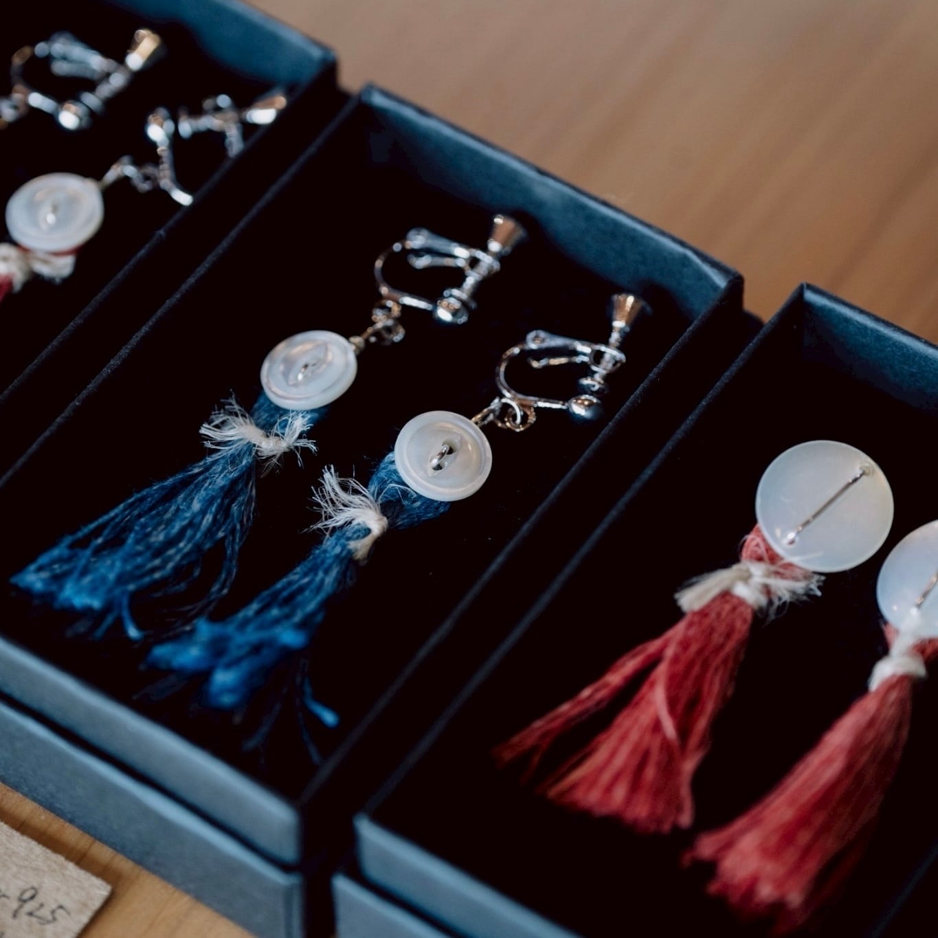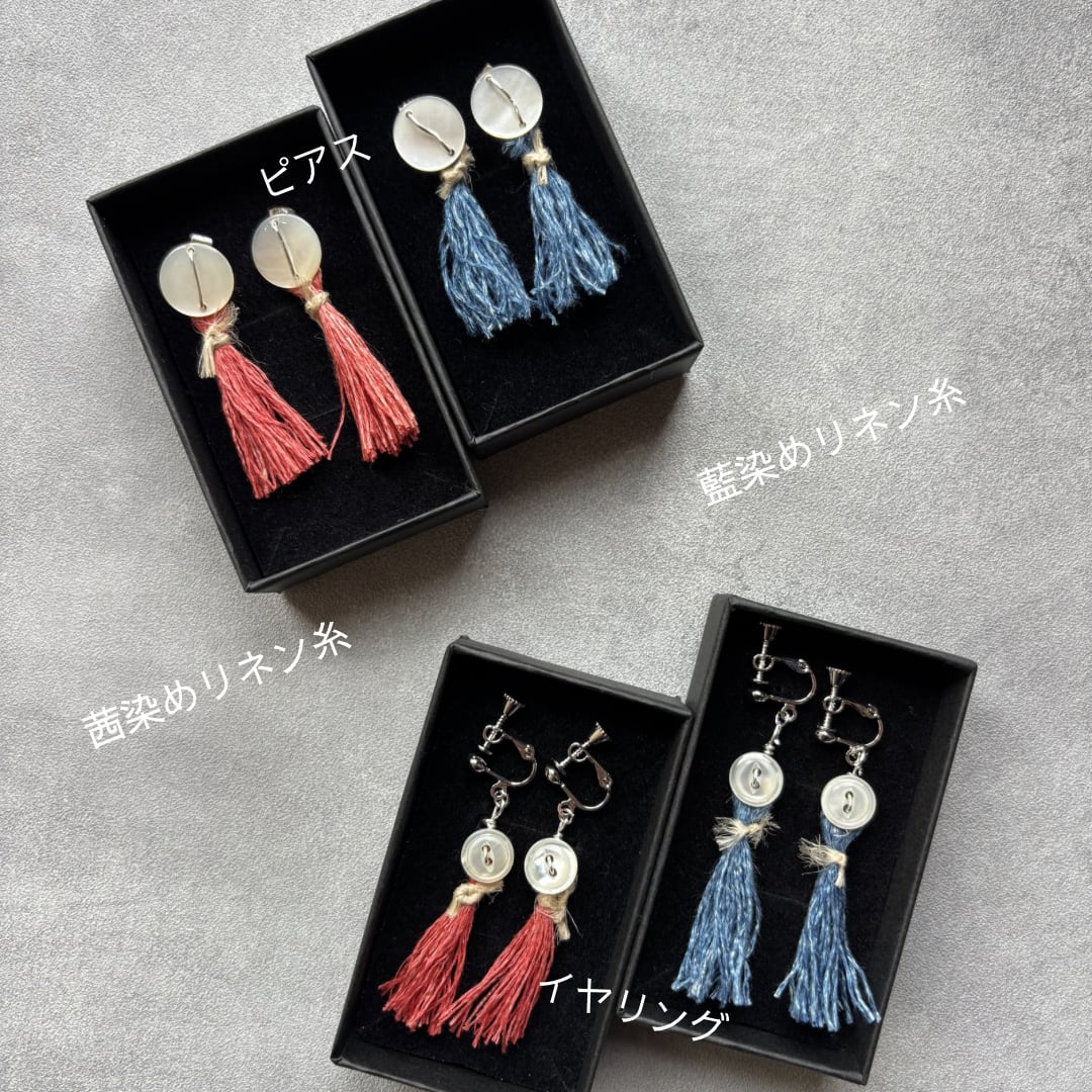 マザーオブパールの輝きにシルバーのライン、風に揺れる藍染or茜染のリネン[麻]糸