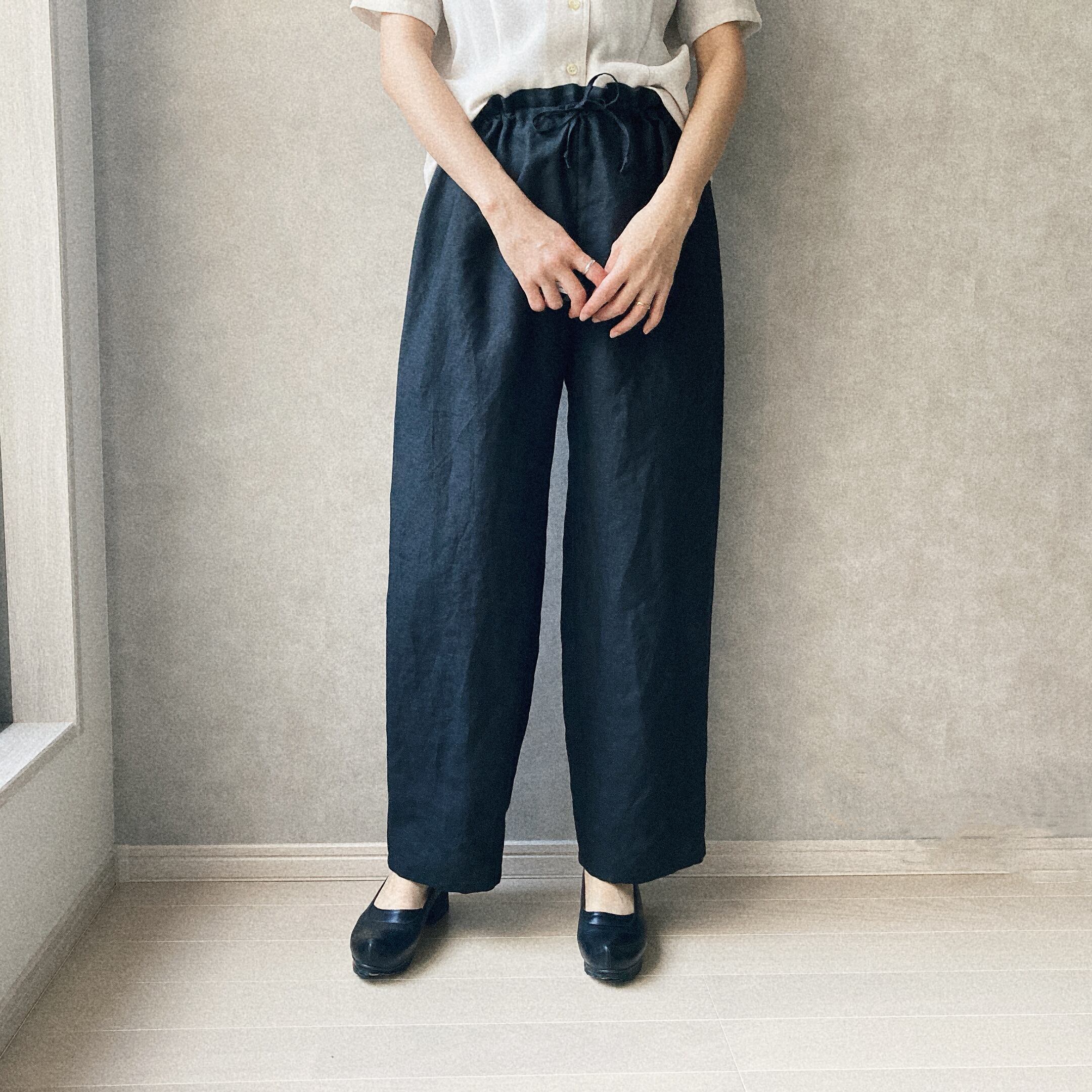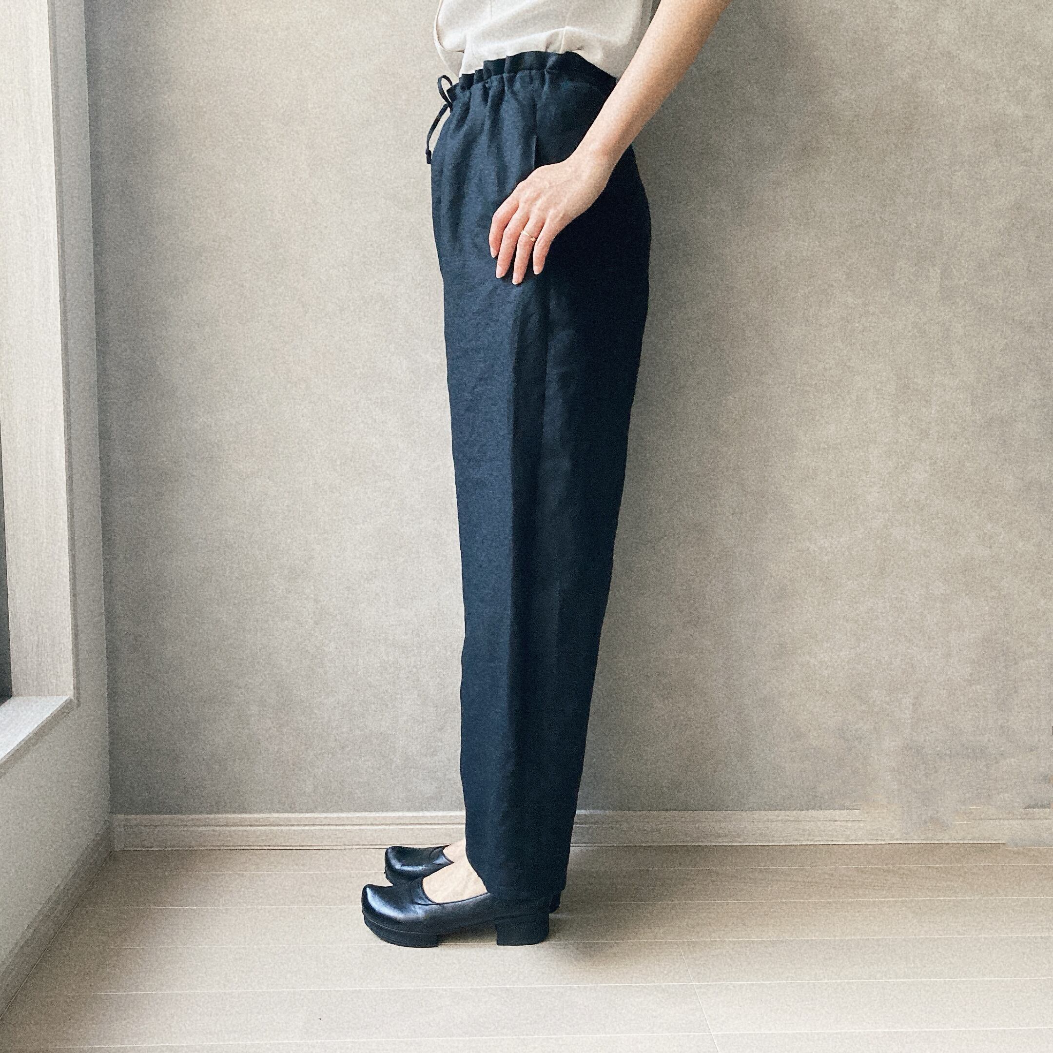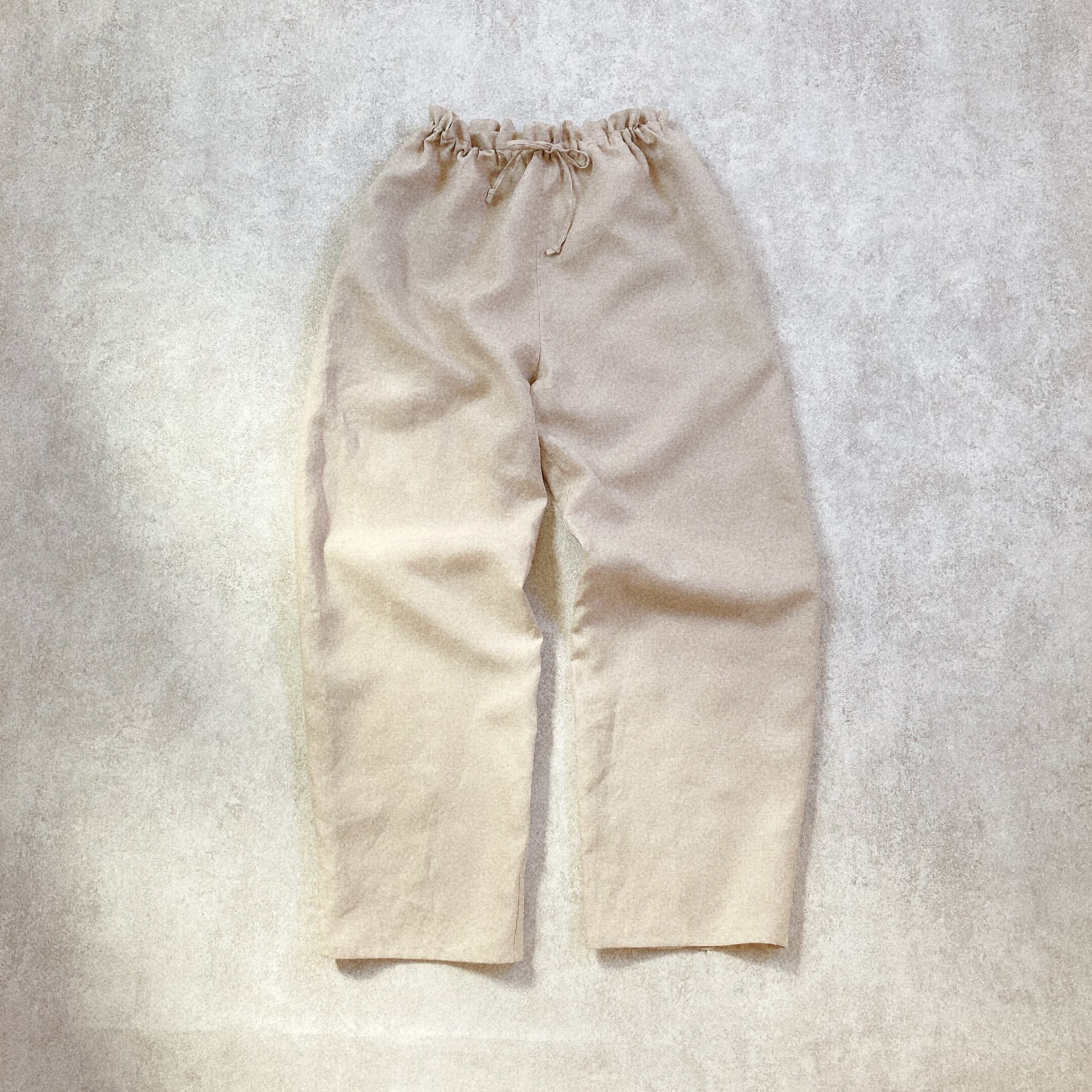 リネンワイドテーパードパンツ(ウエストゴム&紐仕様) リネン100% color : ベージュ / ブラック